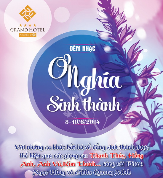 Khách sạn Grand sẽ cùng với các bạn thể hiện tấm lòng của một người con hiếu thảo với cha mẹ thông qua đêm nhạc ‘Ơn nghĩa sinh thành” được tổ chức tại